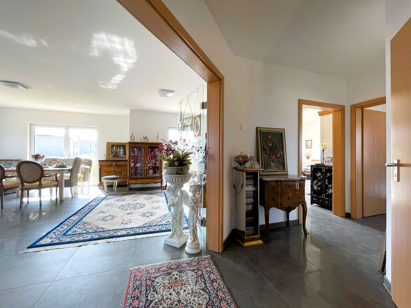 Die verbauten Materialien sind hochwertig und zeitlos. Das gesamte Gebäude ist mit einer Fußbodenheizung, 3-fach isolierverglasten Fenstern mit elektrischen Rollläden und einer hochwertigen Einbauküche ausgestattet. Das Haus ist barrierearm konzipiert.