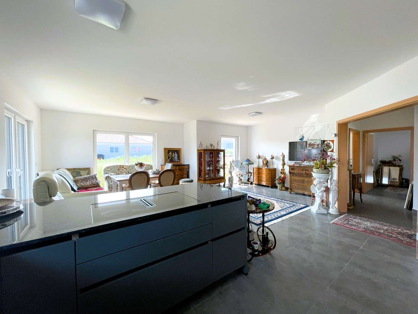 Direkt nach dem Betreten des Hauses, empfängt den Bewohner bzw. Besucher der offen gestaltete Wohn-, Koch- und Essbereich. Direkt an die offene Küche angeschlossen, befindet sich der Hauswirtschaftraum, der zusätzlichen Stauraum für Vorräte oder Haushaltsgeräte bietet. Das Wohnzimmer ist dank der bodentiefen Fenster hell und einladend. Direkt daneben wurde das Schlafzimmer positioniert. Besonders schön, Sie sind stets mit wenigen Schritten auf der süd-westlich ausgerichteten Terrasse und im Garten.