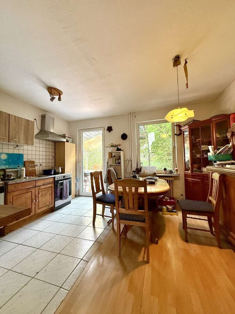 105 m² voller Potenzial. Das Erdgeschoss beherbergt eine abgeschlossene Küche mit Ausgang zum westlich ausgerichteten Garten, ein Gäste-Bad mit Dusche, sowie ein großzügiges Wohnzimmer. Im Obergeschoss wurden 3 Zimmer sowie ein Bad mit Wanne arrangiert. Das Gebäude ist voll unterkellert. Eine geräumige Garage rundet das vielseitige Platzangebot ab. Das Grundstück umfasst eine Fläche von 672 m². Beheizt wird das Gebäude durch Heizkörper und eine Gasetagenheizung. Das Gebäude wurde 2003 umfangreich modernisiert (Elektrik, Sanitär, Heizung).