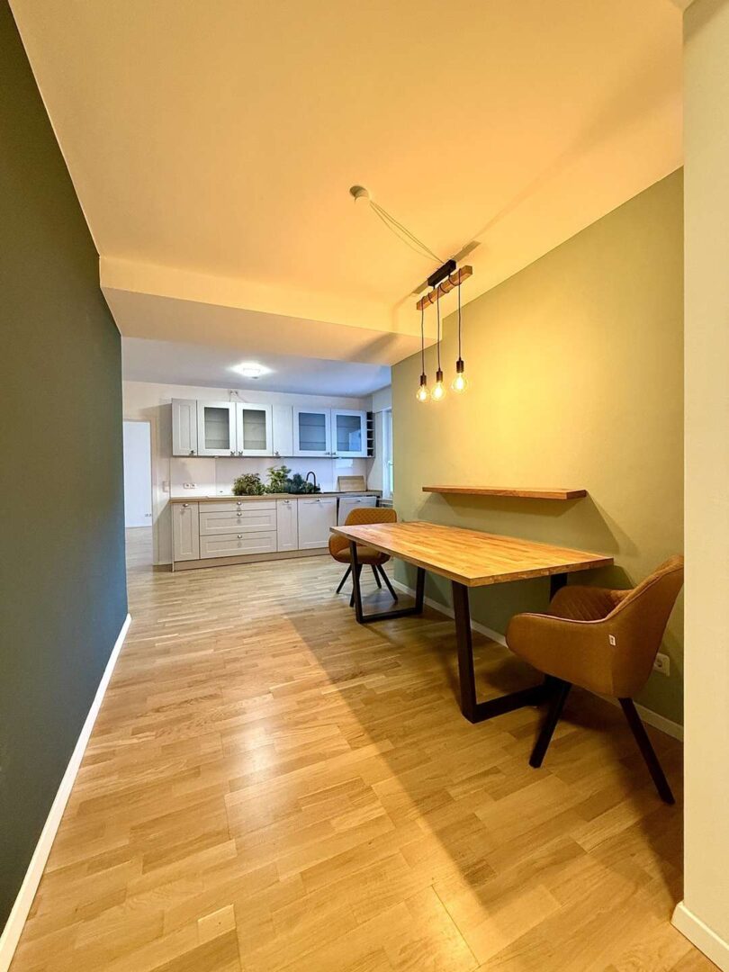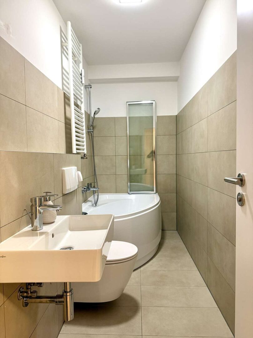 - Badezimmer: Genießen Sie das 2023 stilvoll gestaltete Badezimmer mit ausgesuchten und zeitlosen Materialien. Ein Fenster ist in Abstimmung mit der Hausgemeinschaft denkbar.