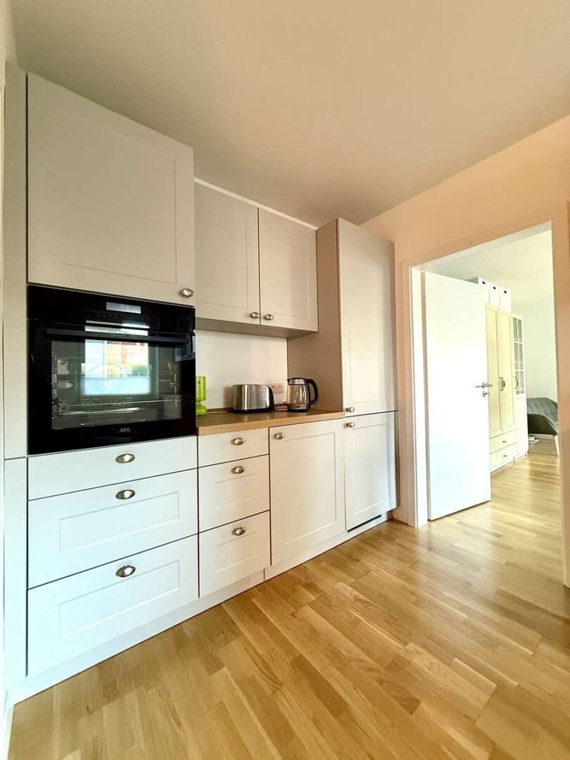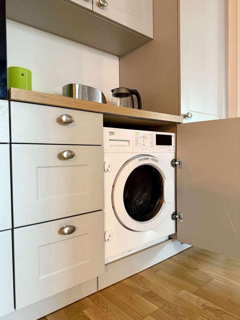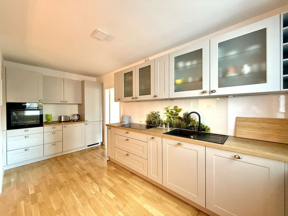 - Einbauküche: Die topmoderne Einbauküche aus 2023 ist mit Markengeräten ausgestattet und verfügt über einen Backofen mit Garfunktion, Kühl-/ Gefrierkombi, Geschirrspüler und einen Waschtrockner.