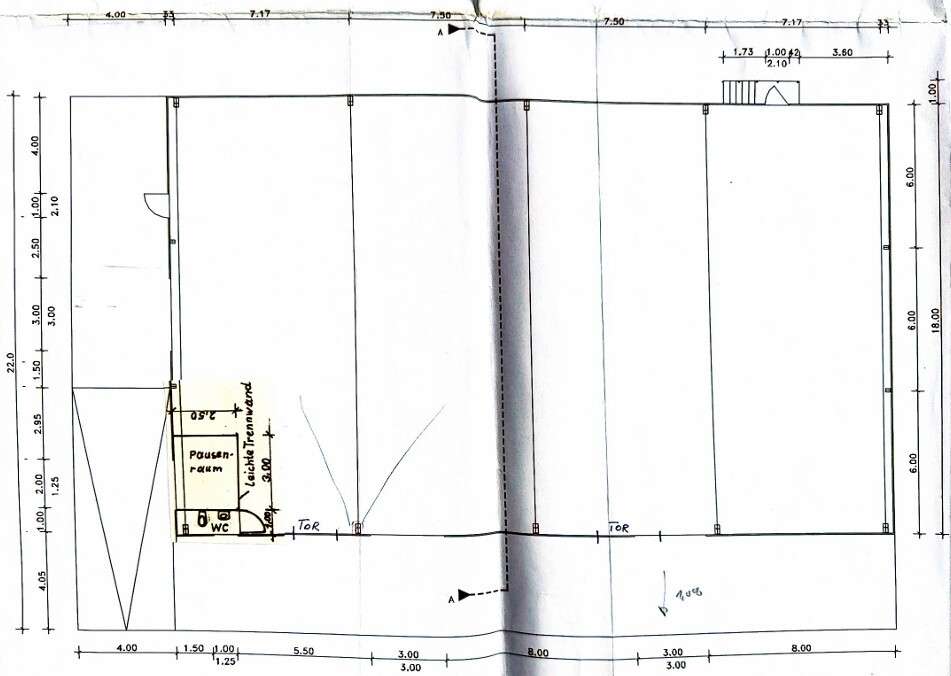 - Umschlaghalle 30 m x 18 m: ca. 530 m² (davon Büro-/ Sozialraum: ca. 40 m²), isolierte Stahlblechhalle (beheizbar: Erdgas) mit Überladerampen und Außenrampe (befahrbar), 3 Sektionaltore (Durchfahrtshöhe: 3 m)