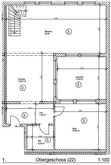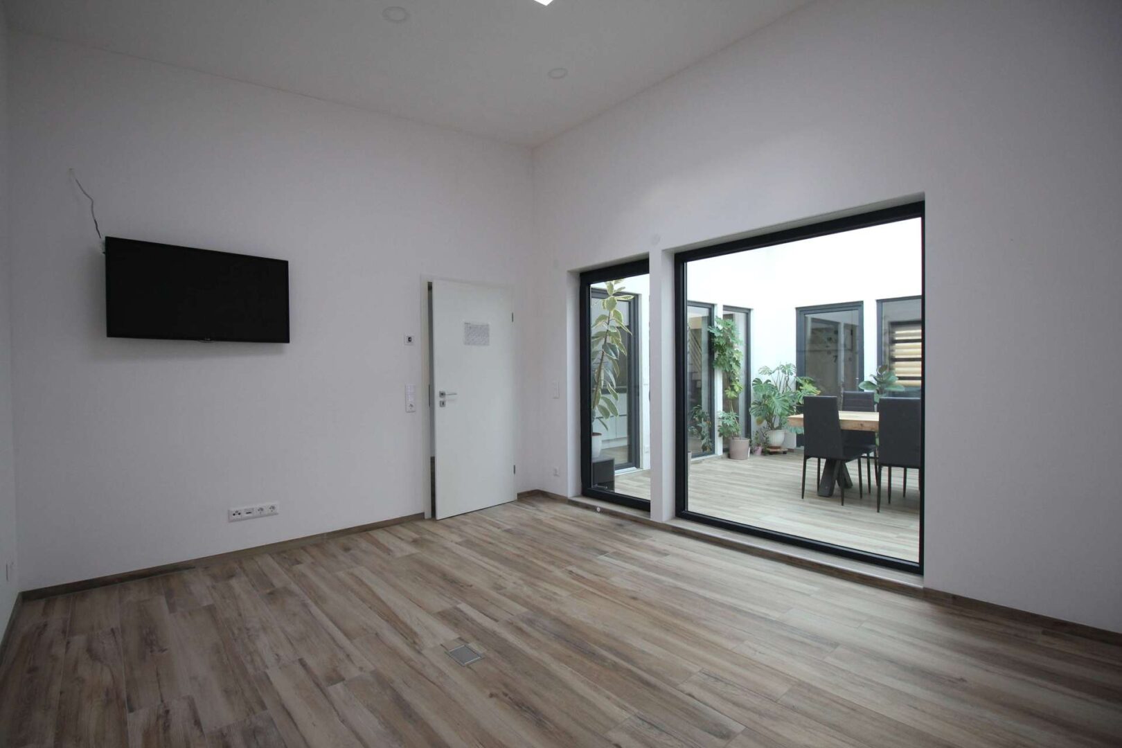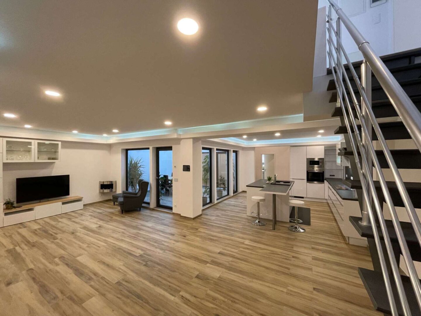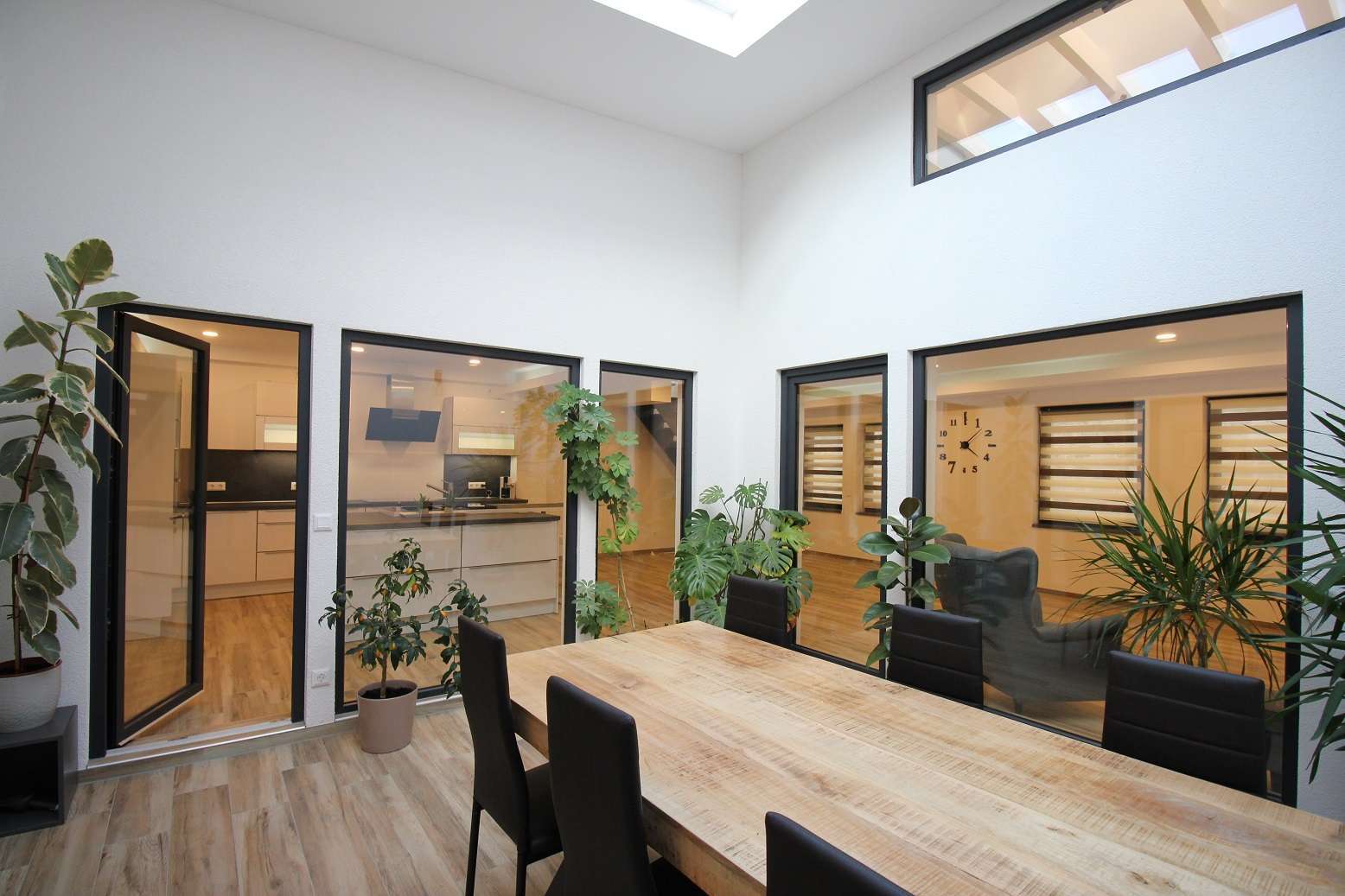 Das Industriegebäude wurde 1970 in massiver Bauweise errichtet und 2018 aufwendig und umfassend nach heutigen energetischen und technischen Anforderungen, modernisiert. Im Ergebnis sind im Gebäude 8 hochmoderne Wohnungen als Eigentümergemeinschaft sowie gemeinschaftliche Bereiche wie Sauna (Infrarotsauna und finnische Sauna), ein Kino, Waschküche und ein Fitnessraum entstanden. Zu den Wohnungen ist jeweils ein Keller und ein Tiefgaragenparkplatz zugeordnet. Weitere Parkplätze stehen, nach Verfügbarkeit, zur Anmietung zur Verfügung. Die zum Verkauf stehende Wohnung bietet auf insgesamt 166 m² Wohnfläche vielseitige Aufteilungs- und Nutzungsmöglichkeiten. Über das Entreé der Wohnung mit angeschlossenem Gäste-WC (mit Dusche) und Büro bzw. Gästezimmer gelangt man in den offen gestalteten Wohn- und Essbereich mit offener Küche. Alleinstellungsmerkmal und Mittelpunkt der Wohnung bildet hierbei ein innenliegender Lichthof, der die umliegenden Bereiche dank bodentiefer Fenster gekonnt verknüpft. Im Dachgeschoss wurden ein Schlafzimmer mit begehbarem Kleiderschrank, ein Kinderzimmer sowie ein Bad mit Dusche und Wanne sowie eine großzügige Dachterrasse arrangiert.