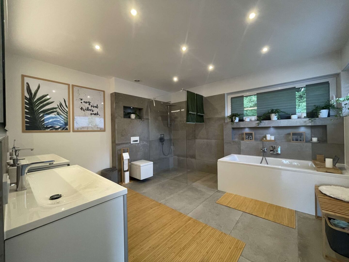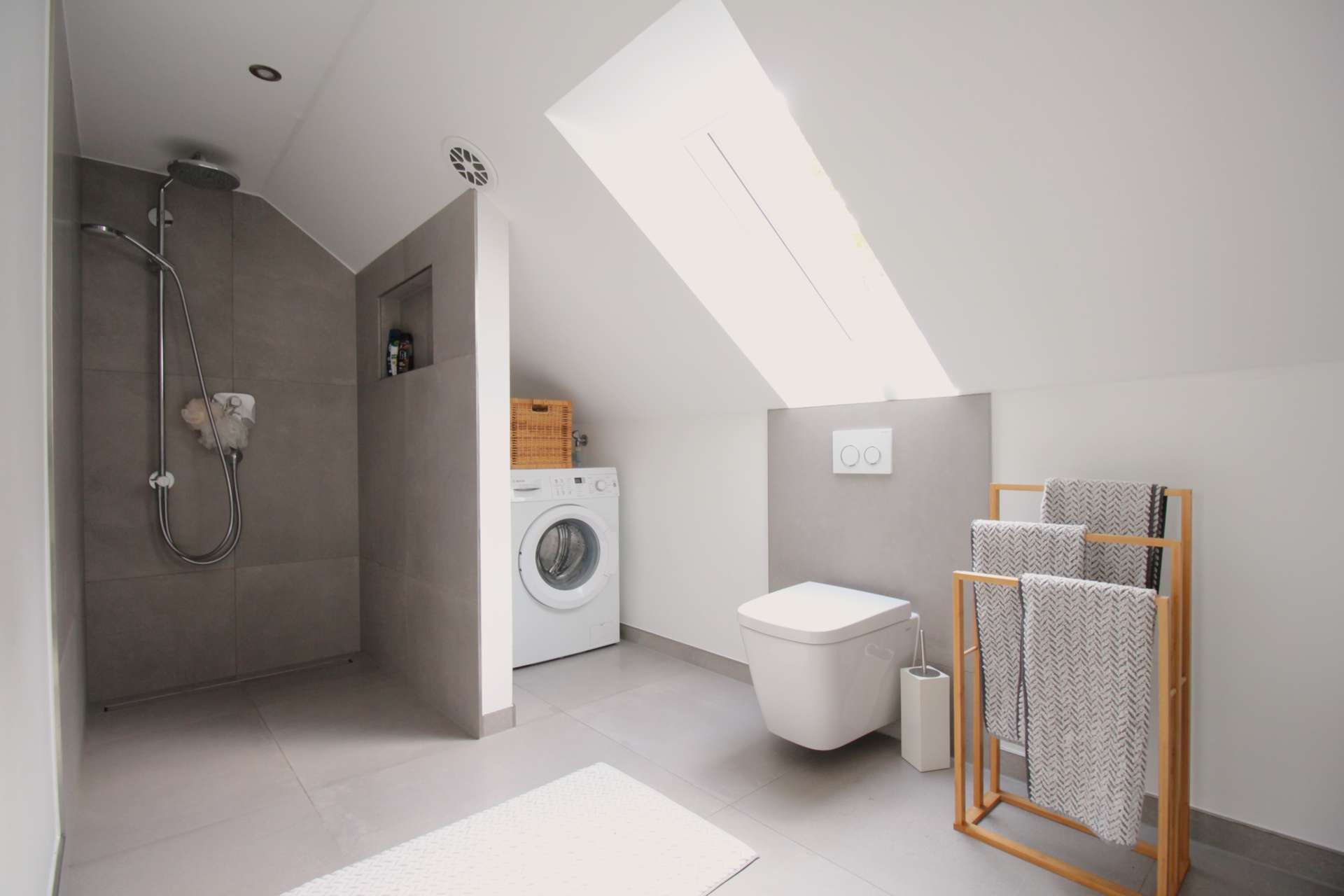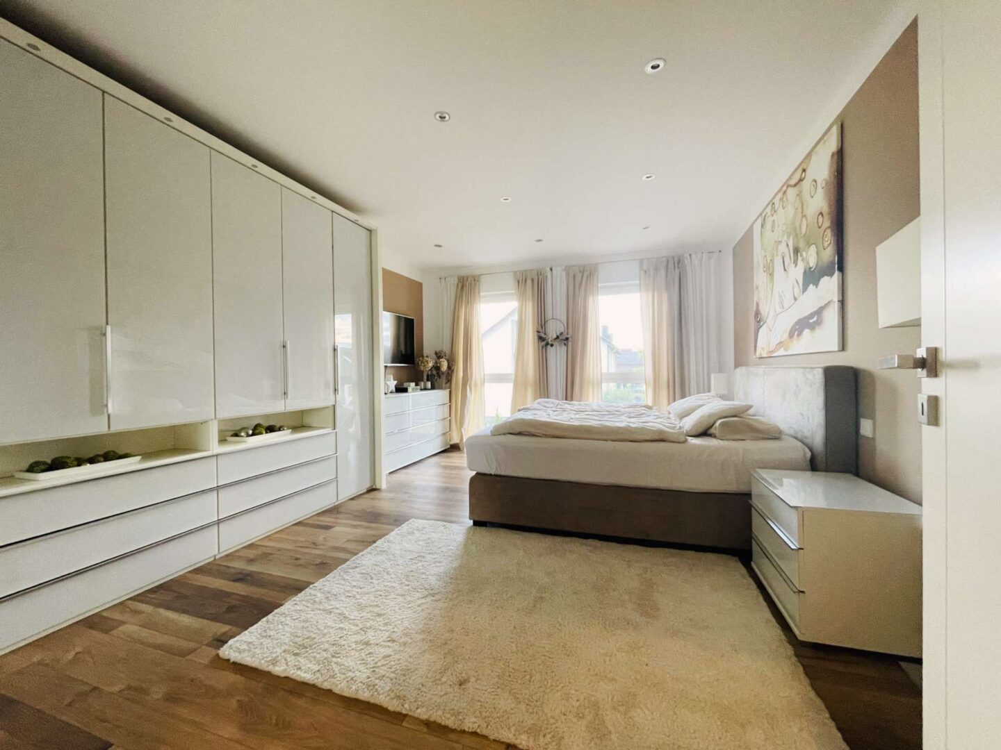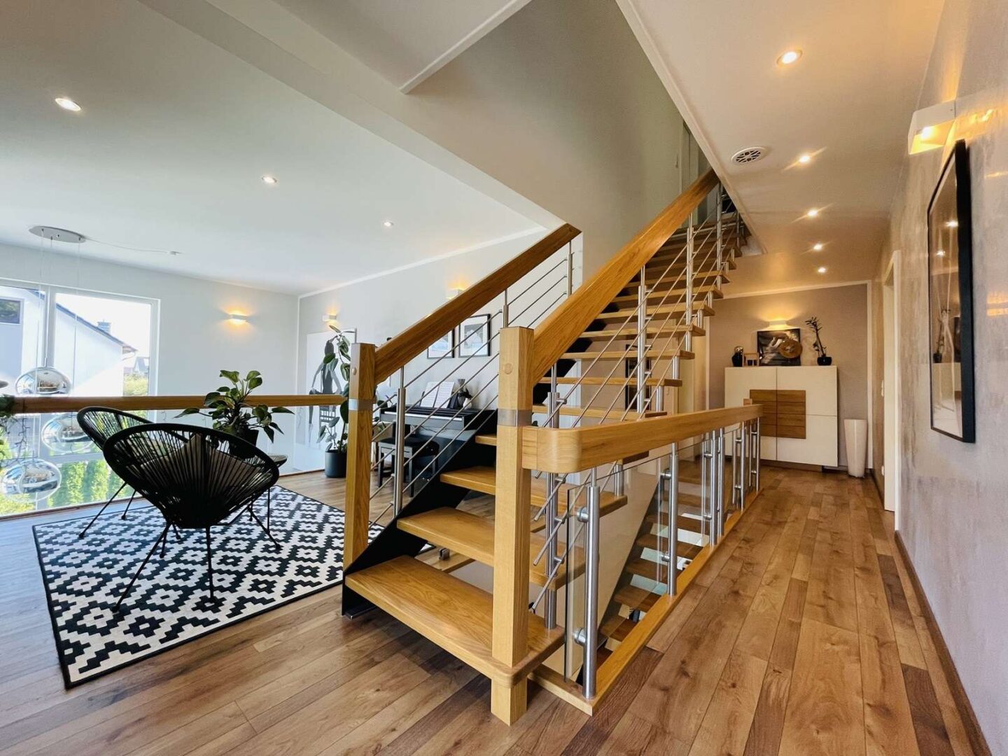 Der Eingangsbereich mit zentralem Treppenhaus, Gäste-WC und Garderobe mit angeschlossenem HWR wurde geräumig geplant. Er lässt bereits einen Blick in das Obergeschoss sowie auf die offene Küche und den Essplatz zu. Küche, Essplatz und Wohnbereich mit offener Galerie ins Obergeschoss wurden in L-Form angelegt – offene Gestaltung durchdacht strukturiert. Im Obergeschoss wurden 2 geräumige Zimmer, ein Bad mit Wanne und ebenerdiger Dusche arrangiert. Die offene Galerie ist hierbei ein besonderer Eyecatcher. Das ausgebaute Dachgeschoss mit Bad und Walk-In Dusche sowie ein geräumiges Wohnzimmer (Unterteilung in 2 Zimmer möglich) und ein weiteres Zimmer runden das vielseitige Platzangebot ab. Auf dem umzäunten Grundstück befinden sich eine Doppelgarage sowie eine westlich und eine östlich ausgerichtete Terrasse.