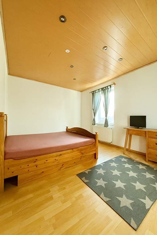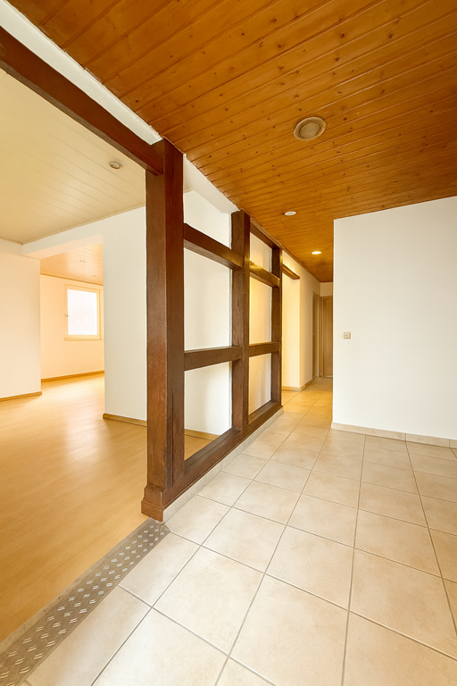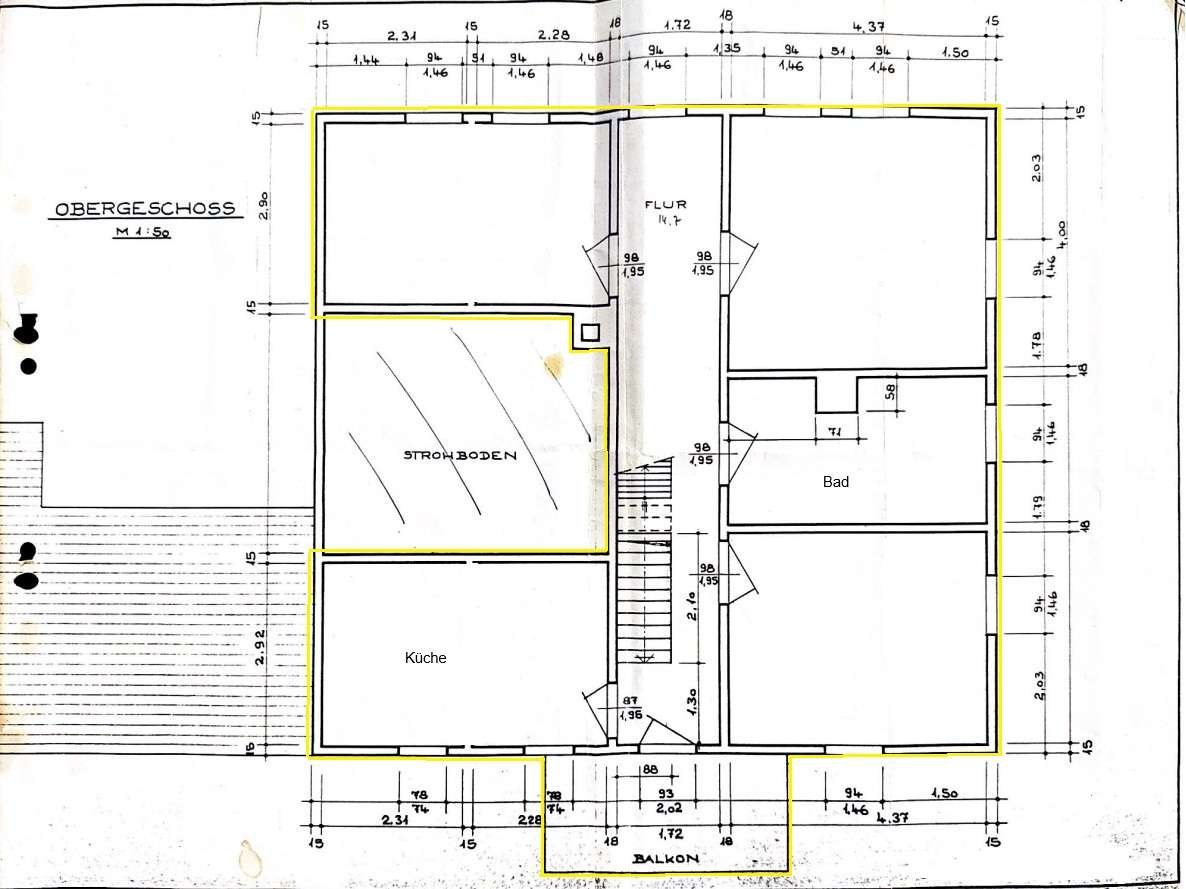 Die Wohnung im Obergeschoss wird vom PKW-Stellplatz erschlossen. Im Erdgeschoss befinden sich der Hauswirtschaftsraum mit angeschlossener Werkstatt. Eine Treppe führt in das Obergeschoss wo 3 Zimmer sowie Bad mit Dusche/ Wanne und Küche arrangiert wurden. Die Wohnfläche umfasst ca. 80 m². Diese Wohnung verfügt zusätzlich über einen Balkon und die Option auf ein 4. Zimmer (nach Umbau). Das Dachgeschoss bietet eine zusätzliche Ausbaureserve. Das Haus ist nicht unterkellert. Das Gebäude wird über Heizkörper in den Räumen sowie eine Gas-Zentralheizung mit Wärmemengenzählern.