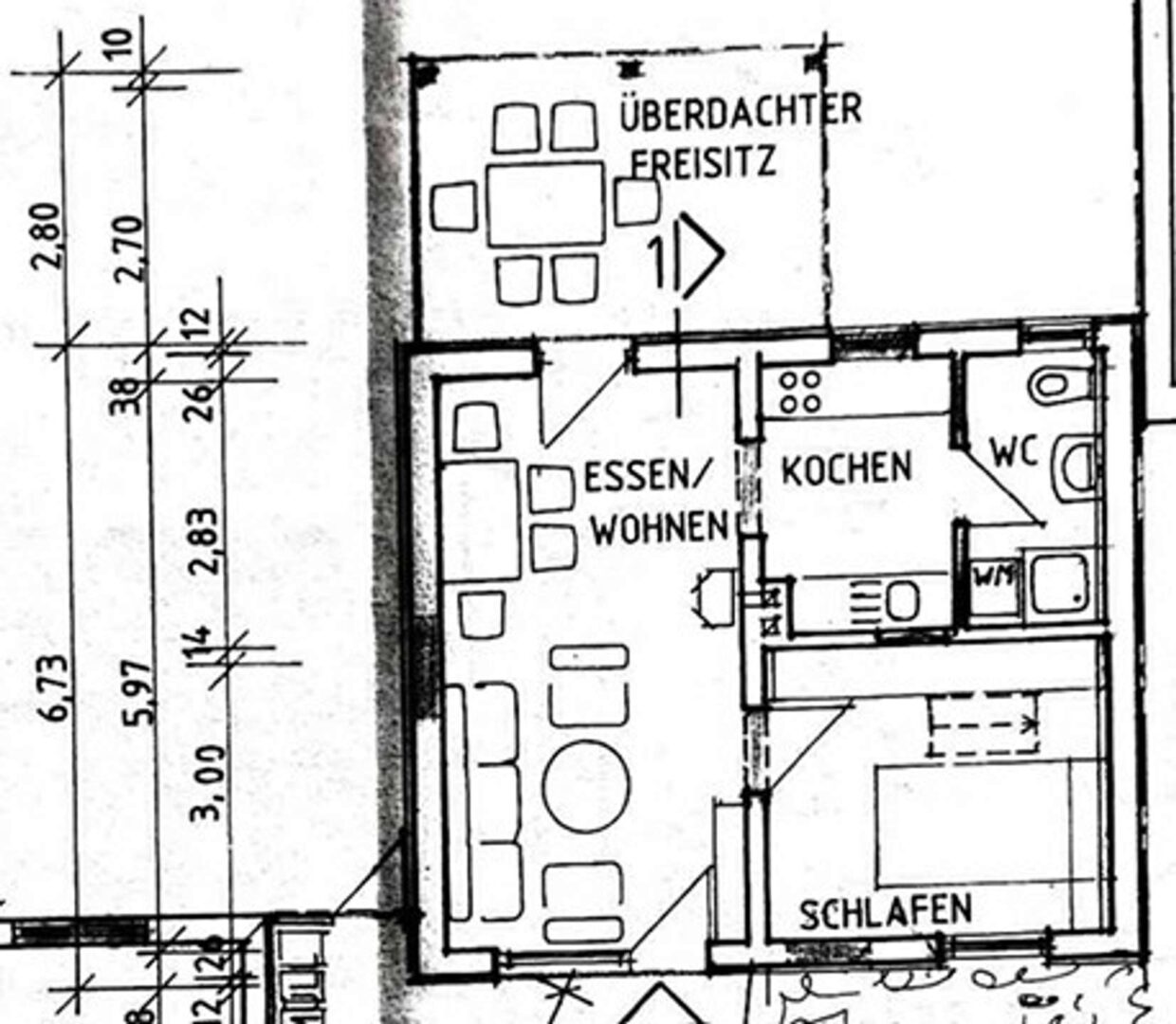 Auf dem Grundstück befindet sich zudem das zurückversetze 2. Gebäude. Ob als Gästehaus, als Wohnhaus für Familienangehörige oder als Homeoffice/ Büro, bietet das separate Haus mit einer Wohnfläche von ca. 42 m², aufgeteilt auf 2 Zimmer, Küche und Bad (saniert 2013), zusätzliche Flexibilität. Auch hier bietet das Dachgeschoss noch eine kreative Ausbaumöglichkeit. Aktuell ist die Wohneinheit vermietet, die monatliche Nettokaltmiete beträgt: € 350.
